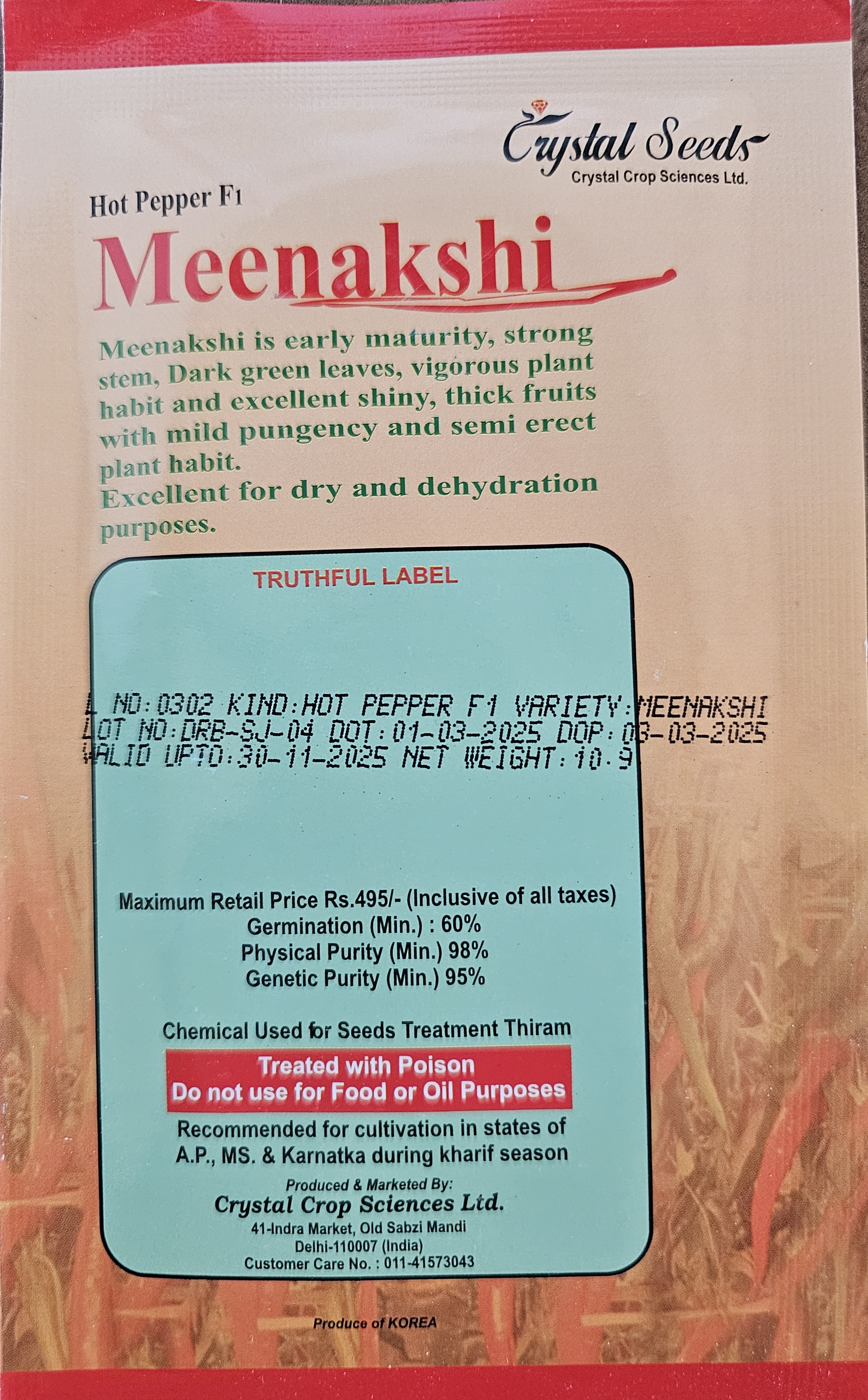 بذر فلفل قلمی میناکشی تند از شرکت کریستال سیدز هند، رقمی هیبرید و پربار است. فلفل قلمی تند میناکشی دارای بافتی متراکم و طعم تندی مطلوب و رنگی بازارپسند میباشد. بنابراین کشاورزان به کشت این بذر فلفل قلمی تمایل دارند. فلفل میناکشی دارای بوتهای قوی به همراه پوشش وسیع شاخ و برگ بسیار خوب، پرگل و بسیار پربار (با باردهی ممتد و پیوسته) و در نتیجه عملکرد بالا میباشد. طول هر میوه بین 14 تا 16 سانتی متر است.